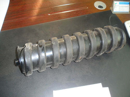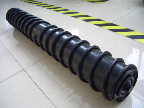 螺旋橡膠托輥是引進(jìn)國外先進(jìn)技術(shù),針對化工行業(yè)固體粘濕物料輸送時存在嚴(yán)重問題開發(fā)研制的科技成果.我公司專業(yè)從事皮帶機(jī)螺旋橡膠托輥的制造和銷售,該產(chǎn)品在國內(nèi)享有千家的用戶,還遠(yuǎn)銷東南亞各國。該產(chǎn)品的問世,從根本上解決了帶式輸送機(jī)普遍存在的腐蝕,粘輥、膠帶跑偏和撕裂等嚴(yán)重問題。具有結(jié)構(gòu)新穎、安裝維修方便、自定中心輸送平穩(wěn)、不粘輥、噪音小,能耗低及延長膠帶使用壽命特點。填補(bǔ)了國內(nèi)空白,并被多家部屬化工設(shè)計院納入通用設(shè)計規(guī)范。